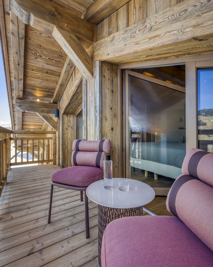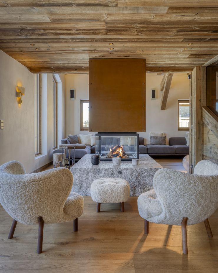 Le salon lumineux, agrémenté de grandes baies vitrées, offre des vues panoramiques imprenables sur les montagnes enneigées, tandis que la cheminée en pierre naturelle crée une atmosphère accueillante idéale pour se détendre après une journée sur les pistes.